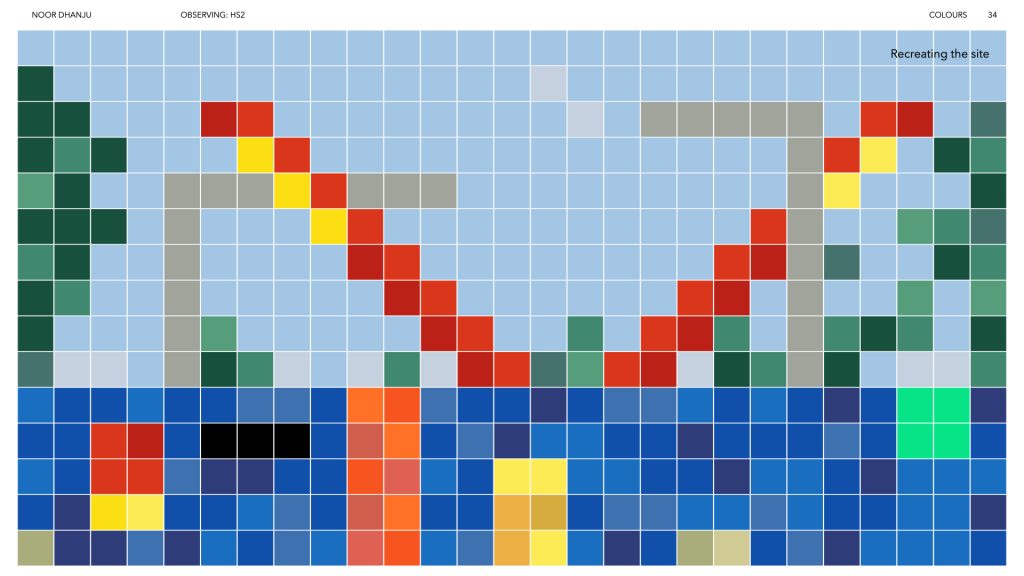 I wanted to explore what perceiving the site solely through these colours would say to me about the site, and created a pixel/ grid artwork (inspired by one of the exercises we did in class), and see if it changed my perception of it. I found it communicated nothing new to me, but exploring the colours was interesting, and I wanted to explore that further.